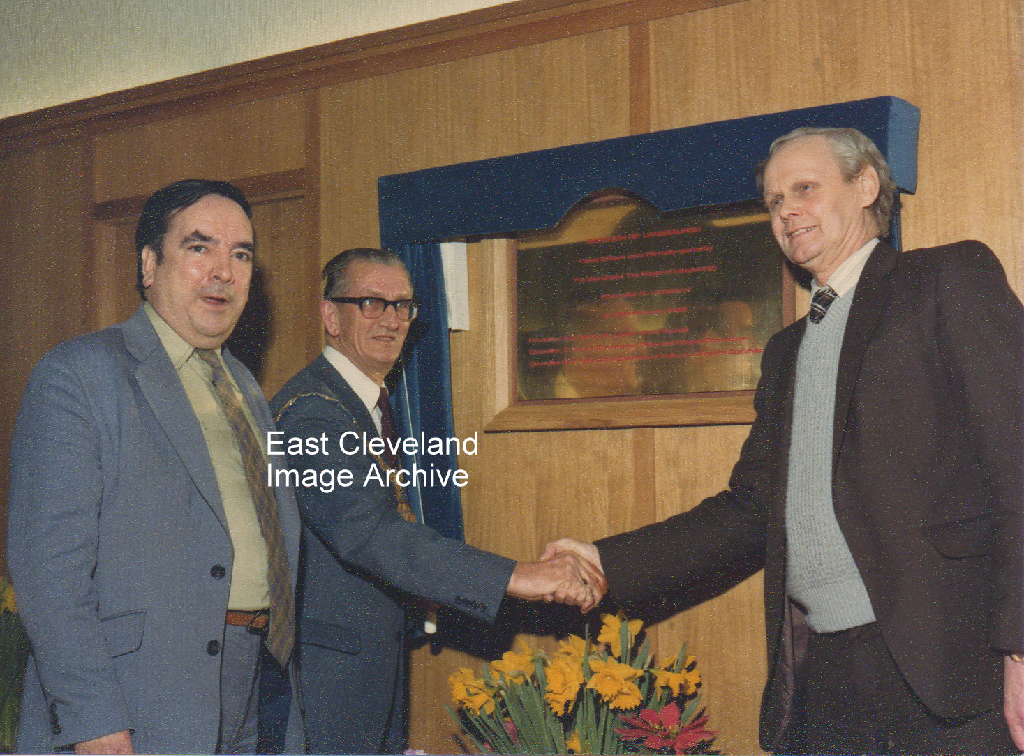 The unveiling finished, job done. Ray Tough informs us: ”It was probably the opening of the new extension at Eston Town Hall with the new Mayor’s office and Councillor’s room. Left to right are Councillor Arthur Taylor, Norman Lantsbery and Council Leader, Arthur Seed.” Image courtesy of Loftus Town Council and thanks to Ray Tough for the update.