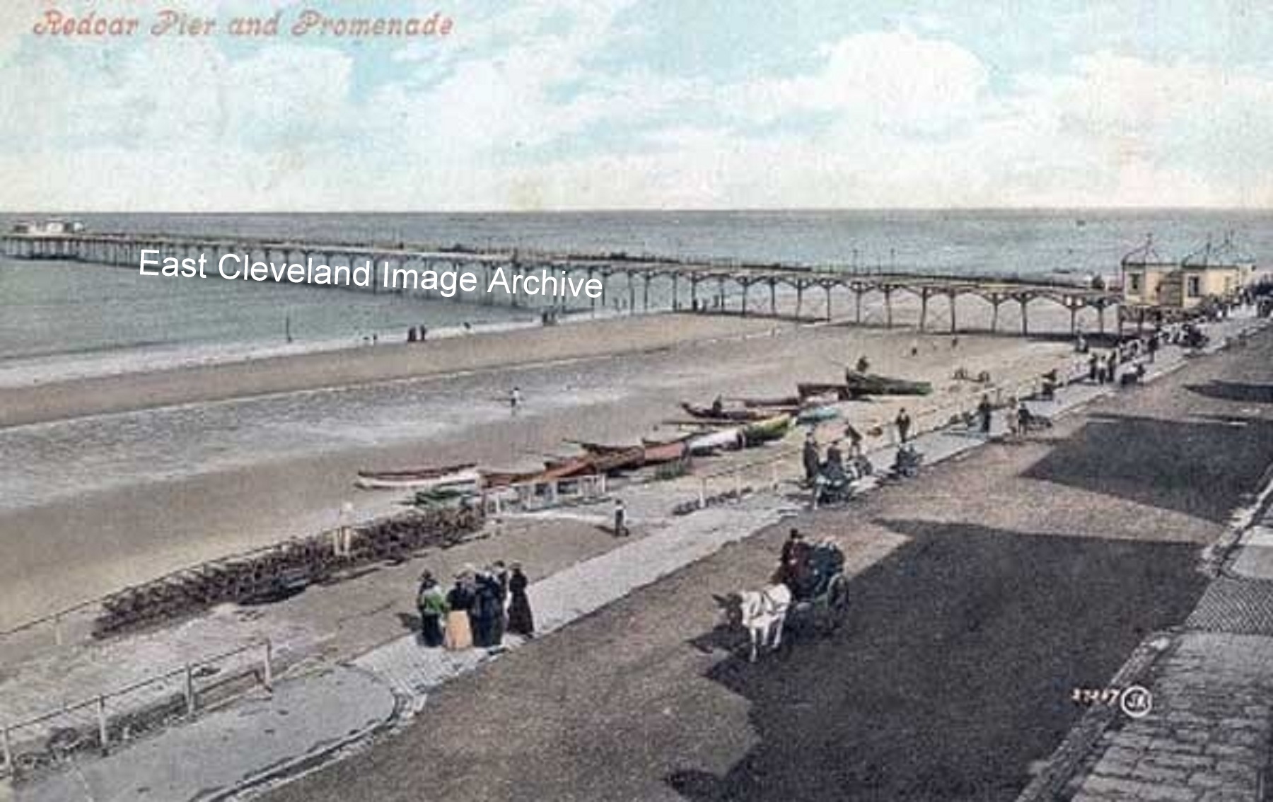 A lovely tinted image (from a Valentines postcard) of a lazy day on Redcar promenade, with the beautiful long pier jutting out into the sea.
