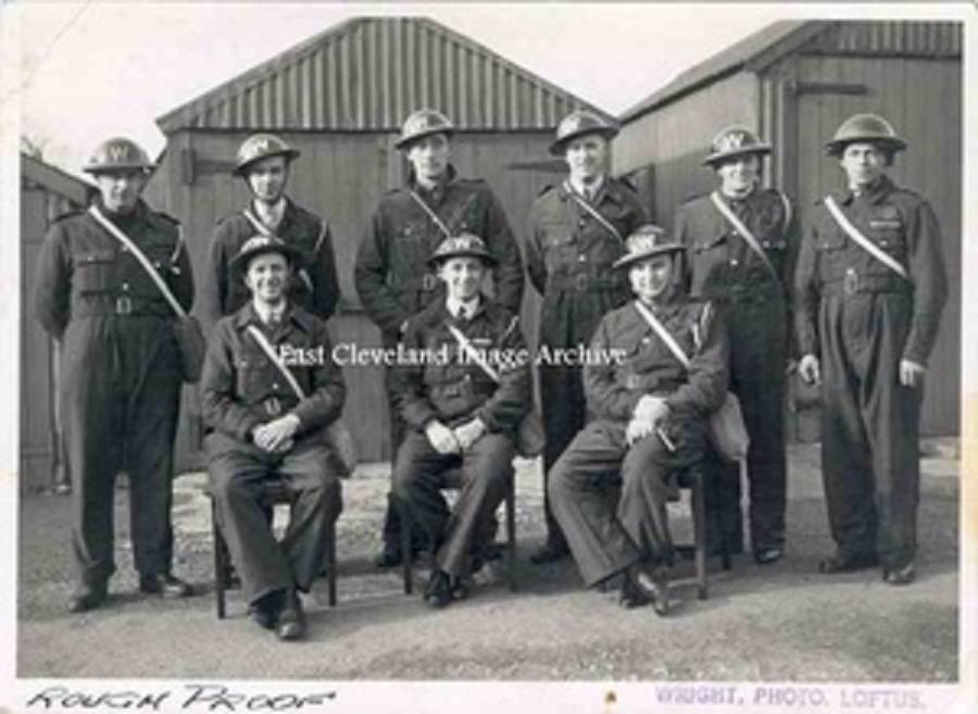A fine body of men, much maligned during those war-time years, pose in full uniform for a formal photograph, now known to be taken in front of the garages on Kilton Lane, Carlin How. Names and a date would be much appreciated.