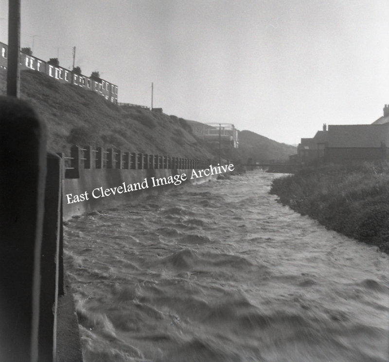 Skinningrove Beck in flood downstream from the gas holders.